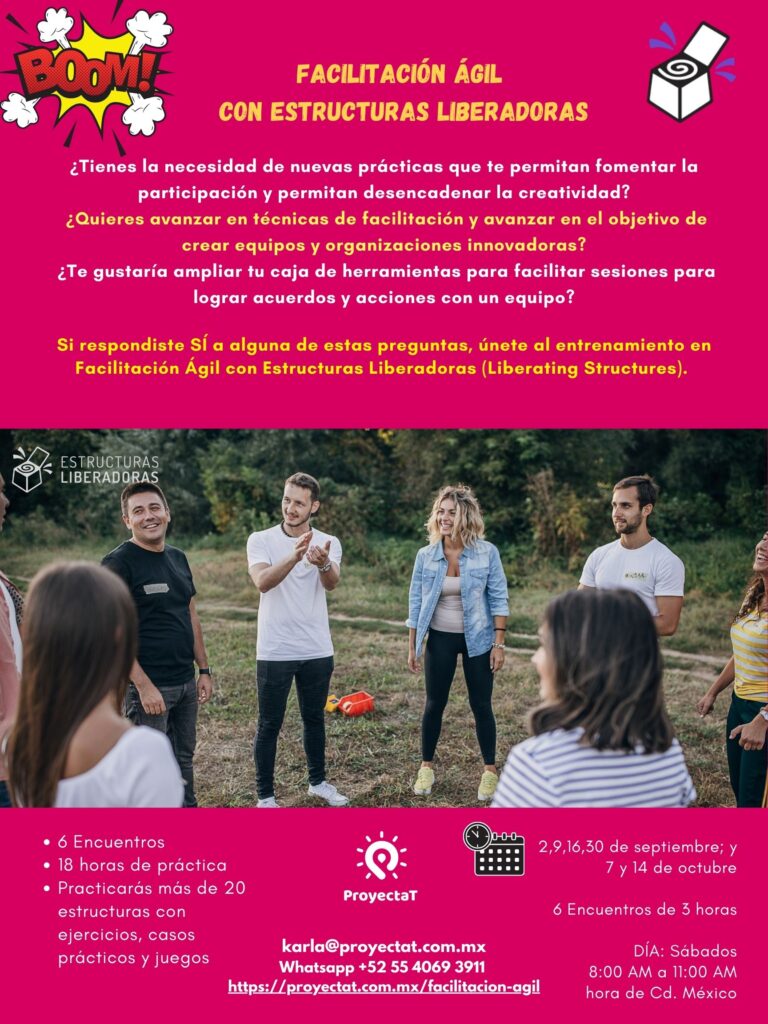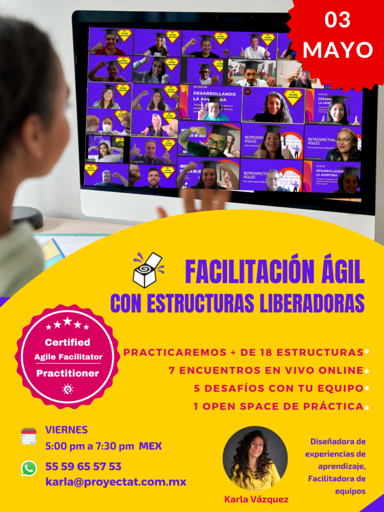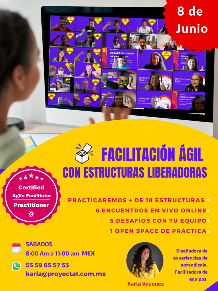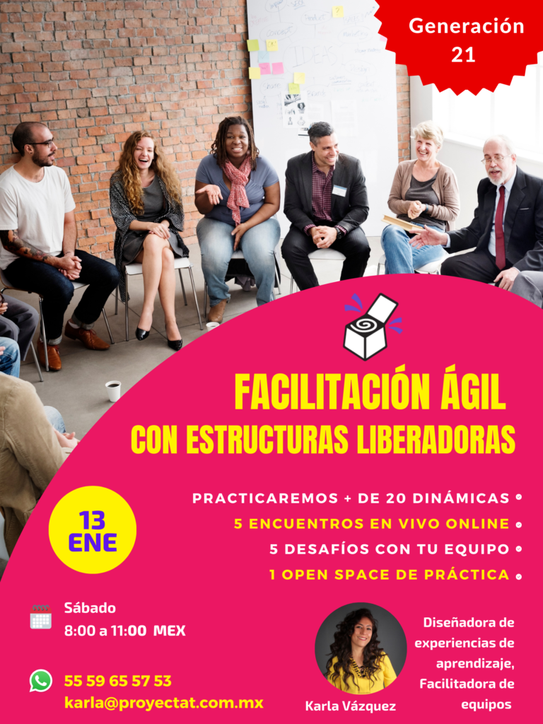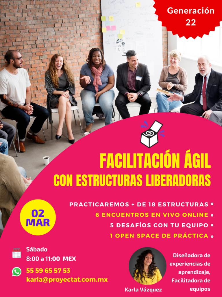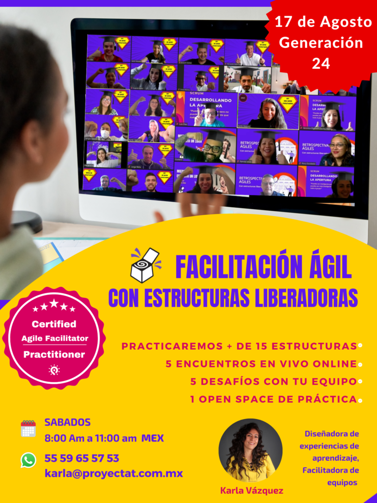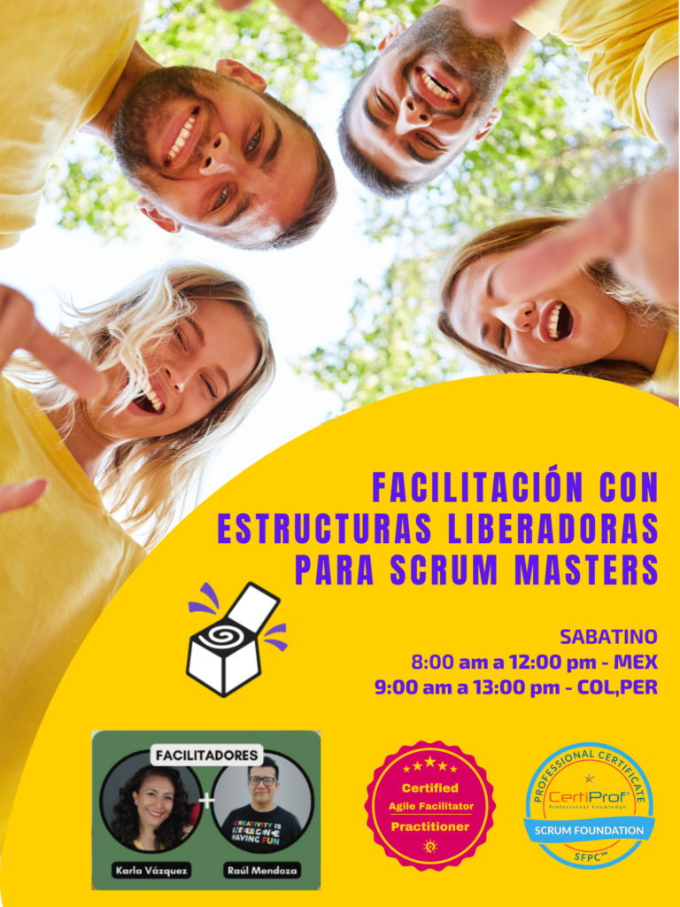9 de octubre Facilitación Ágil con Estructuras Liberadoras Online Inicia 09/10/2024 17:30 – 19:40 hrs (GMT -6) Organiza: Karla Vázquez ¿Eres Scrum Master, Consultor, Thinker, Líder de Proyecto, Agile Coach,Instructor...